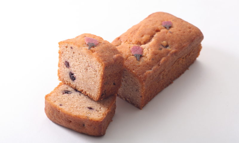 桜葉とダークチェリーを 生地に混ぜ込んでしっとりと焼き上げた 春の香りのパウンドケーキ